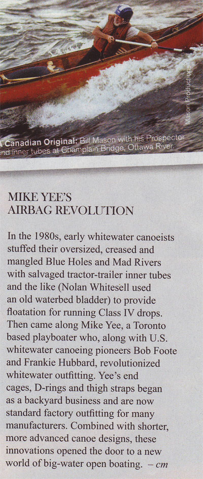 Mike Yee was listed as the third of fourteen visionaries that changed the sport of paddling by Canoe & Kayak Magazine (www.canoekayak.com) for his pioneering of whitewater outfitting.
