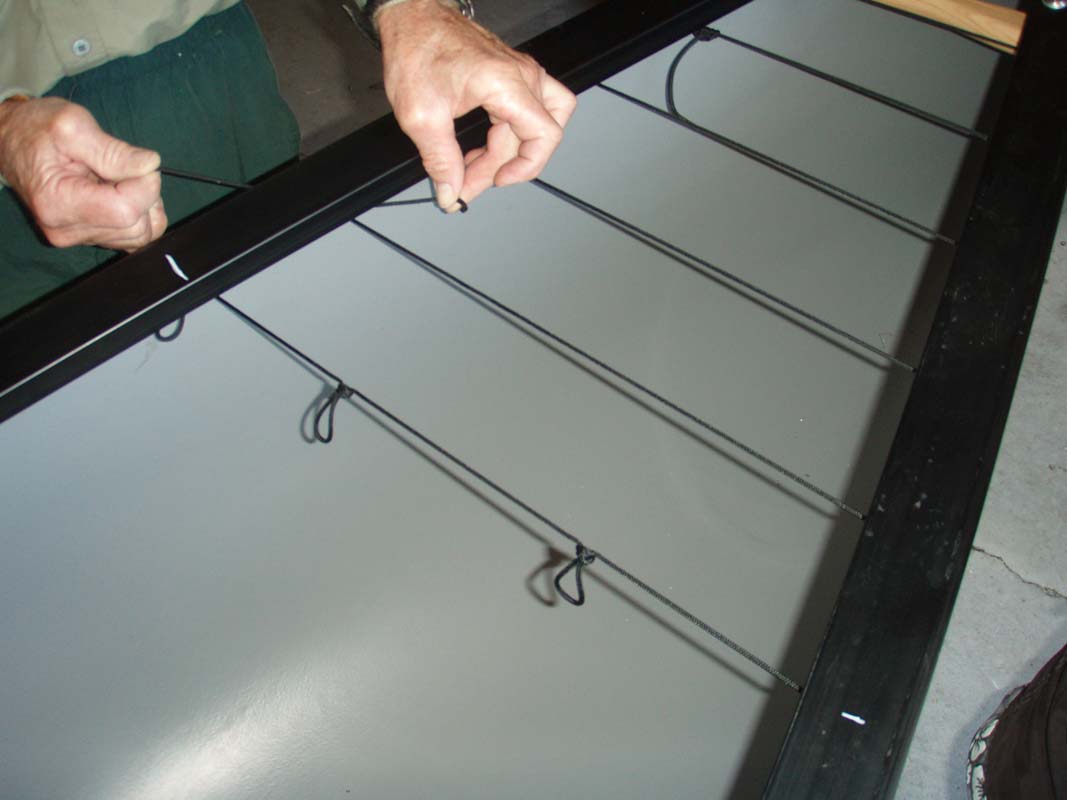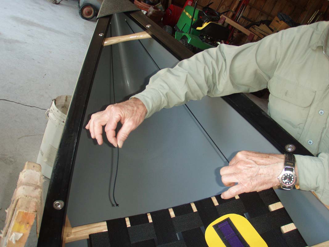 After patches are set, take a length of cord and tie it off to one of the loops at the gunwale end, run it through one of the bag rings, then up to the next loop, down to the center ring, up to the next loop, etc. till you reach the other gunwale loop and tie it off