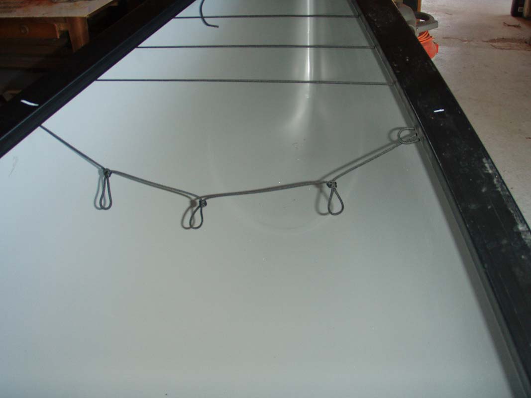 With the cord in place take two bag rings and one releasable bag ring Place the releasable bag ring in the center of the boat at the end of the cord and mark it Take the other two rings and space them evenly between the center ring and the sides of the boat, mark them Your bag cage is now mapped out and ready to glue When looking at the cage the bag rings and the cord loops should be alternately spaced (pic 5M) Wipe down the boat surface area and the patch with acetone Apply a thin layer of glue to both surfaces and let dry for approx 10-15 mins |