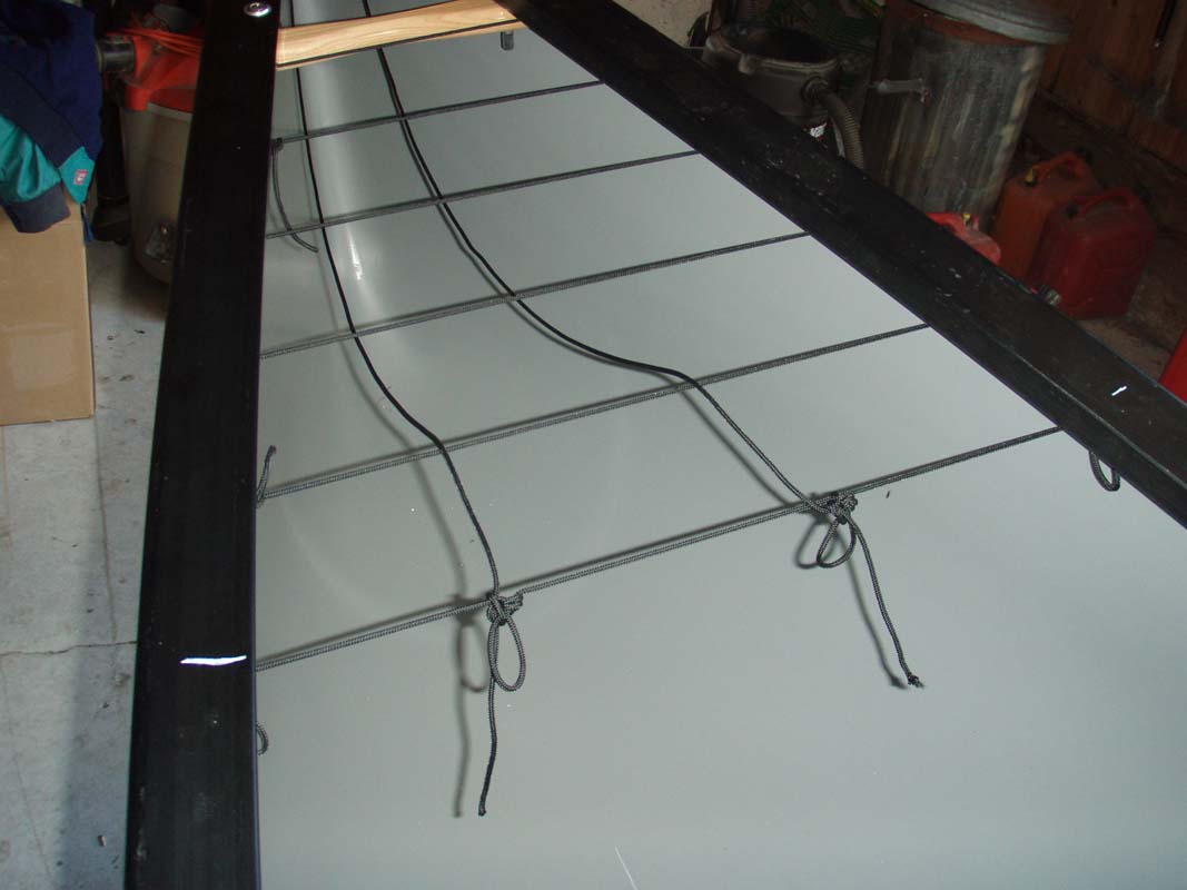 At the paddler end of the cage tie off 3 more loops, one on each side of the boat against the gunwale and two more approx 6 inches towards the center of the boat (pic 4L), finish off cage as in step above (pic 4M)